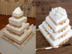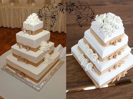 Oh my gosh, oh my gosh, will someone please make us a cake replica ornament for Christmas? I suppose some people might not want to be reminded of their wedding cake wreck, but I think it would be excellent! Every disastrous detail must be replicated so that we can hang it on our tree and tell the tale of The Cake for years to come.