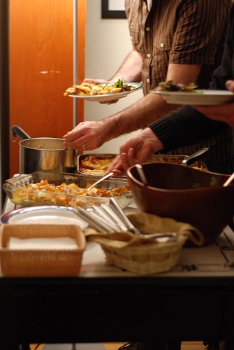 As I mentioned, on Saturday we had a potluck dinner. Our new(ish) apartment is good for hosting things like this (although really, everyone clumps together, regardless of how much space there is. At one point in the night everyone was in the dining room and kitchen– the living room was totally deserted). While snow fell outside, our home was full of sweet and fun friends who brought delicious and cozy wintery things like: