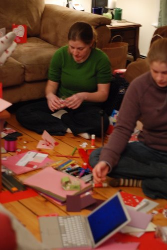 This past weekend brought, in a two shifts, seven visitors from five states. It brought the closest hitting (so far) very-bad-news-as-a-result-of-the-economy as a good friend lost her job when the magazine she worked for folded. It brought cheering-up, Valentine-making, secret missions, Tetris-playing, jolly-making, and reminiscing. We drank wine and tea, made Valentines, crocheted hats and scarfs, played Tetris, strolled in Northampton, ate pizza and blondies and noodles and bagels, and of course talked and talked, laughed and laughed.