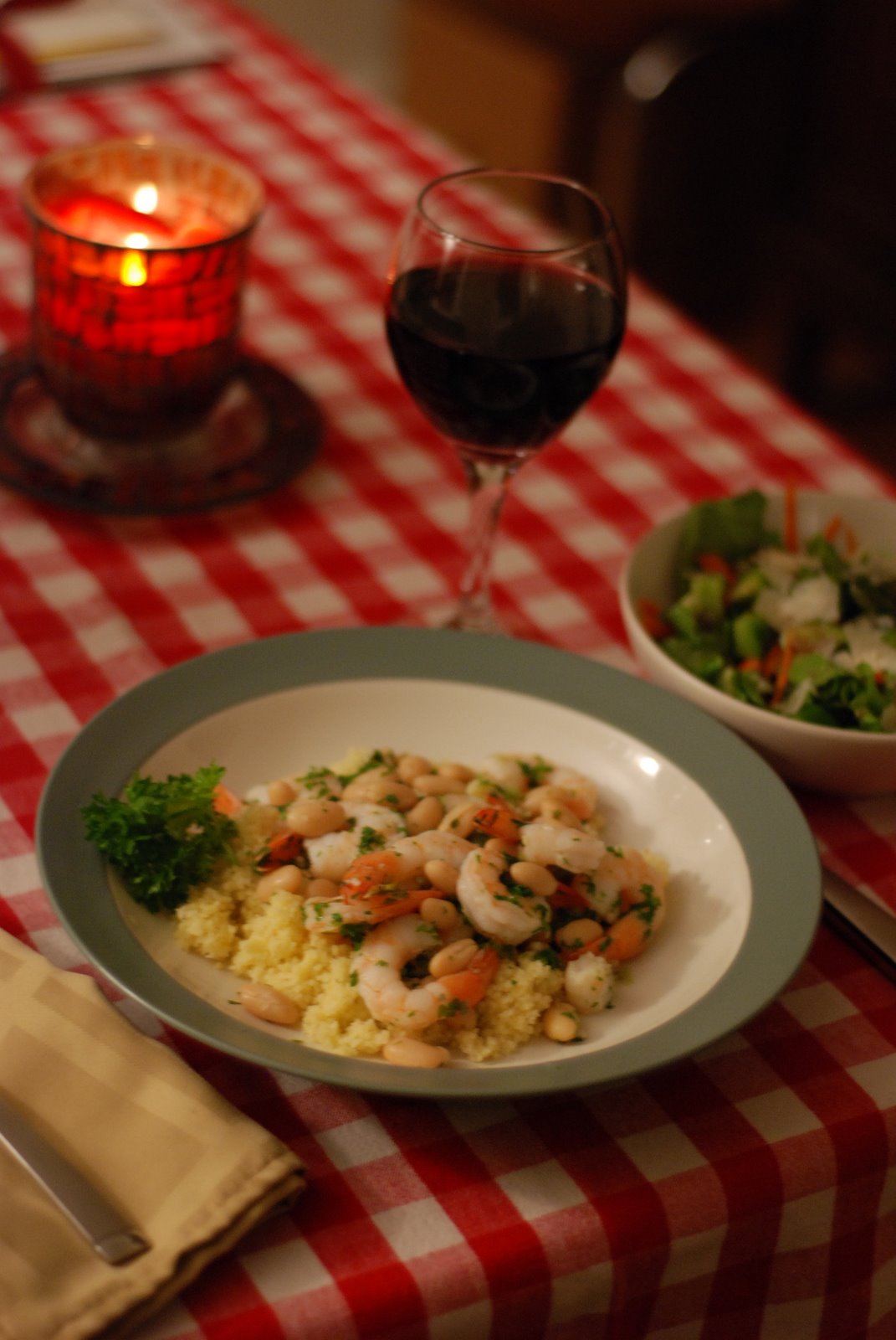Monday- lemony shrimp with white beans and cous cous (February Real Simple). Here’s what it looked like (this was one of my favorites of the week):