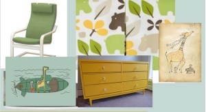 This is where we’re headed with the baby’s room. So far the walls are painted. We have the chair, which might be painted. We have the dresser (below), which will be painted a yellow similar to the dresser above. We may or may not have a crib. Window shades will be ordered this week. We’ve purchased and framed the submarine print (that giraffe!) We need to find a rug- looking for something not super expensive, ideally natural wool or cotton. Possibly gray, maybe brown or tan. Suggestions?