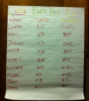 We each went to work consumed by the ‘what ifs’ and ‘what nows’. I tried to put it out of my head until the evening. My co-workers threw me a little shower and ordered Indian food. There was a Baby Pool to guess the date the baby would be born and whether it would be a boy or a girl. One of my colleagues joked that I’d be going into labor over the weekend. I told him no way, that’s crazy, I hadn’t had a single sign that labor was anywhere close to happening. He swore, yep, soon. No way, I said, I’ll see you Monday. (Perhaps one of the only signs I had of impending labor was the deep cleaning and organizing I gave my desk that afternoon).