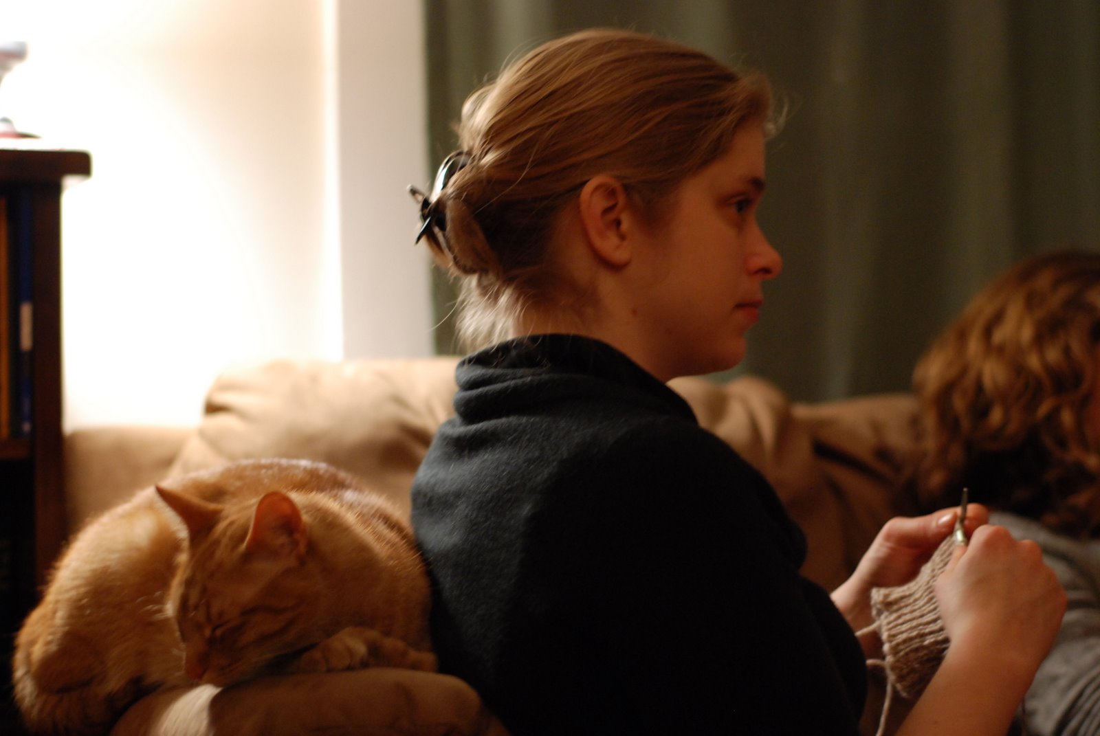 Here’s Em last weekend, working on the leg warmers while Calvin catches a snooze.
